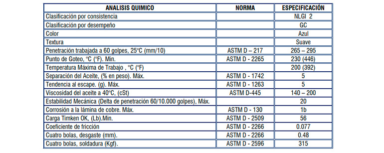 - Cumple con la norma técnica colombiana NTC 1731. Grasas lubricantes para uso automotor.